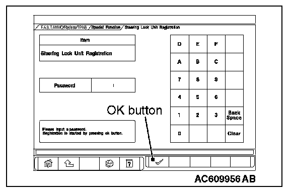 1. Enter the password on "Steering Lock Unit Registration" screen and press the OK button to register the KOS ID.