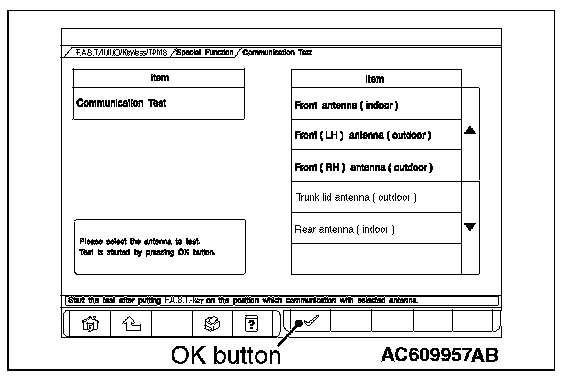 1. Select the antenna to be tested on "Communication Test" screen, and press the OK button with the keyless operation key placed within the communication operational area.