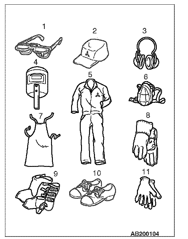 During body repair work, a work suit, a work cap, and safety shoes should be worn at all times. Depending on the work being done, safety glasses, gloves, ear protectors, a dustproof mask, etc., should also be worn as needed.