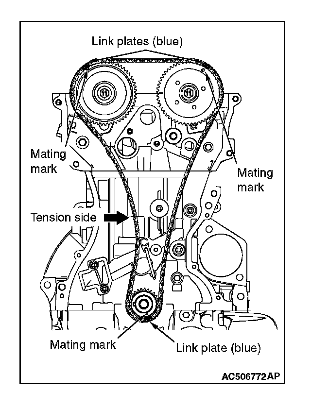 2. Align each sprocket timing chain mating mark with the link plate (blue) of timing chain to avoid slack of the timing chain tension side, and install the timing chain to the sprockets.