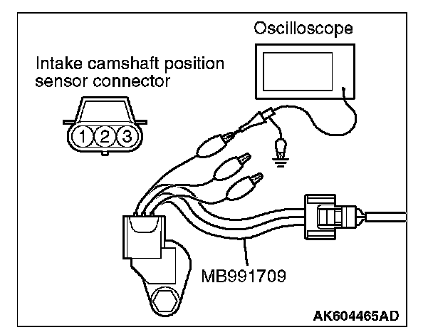 1. Disconnect the intake camshaft position sensor connector,and connect the test harness special tool (MB991709)between the separated connector (All terminals should be connected).