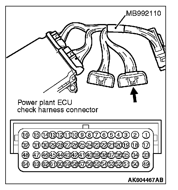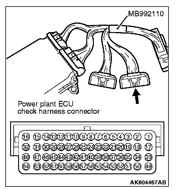 1. Disconnect all ECM connectors. Connect the check harness special tool (MB992110) between the separated connectors.