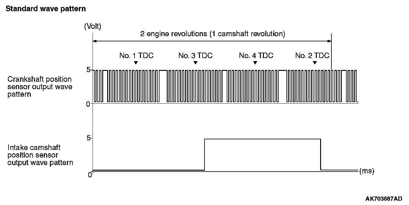 INSPECTION PROCEDURE USING AN OSCILLOSCOPEINTAKE CAMSHAFT POSITION SENSOR AND CRANKSHAFT POSITION SENSOR