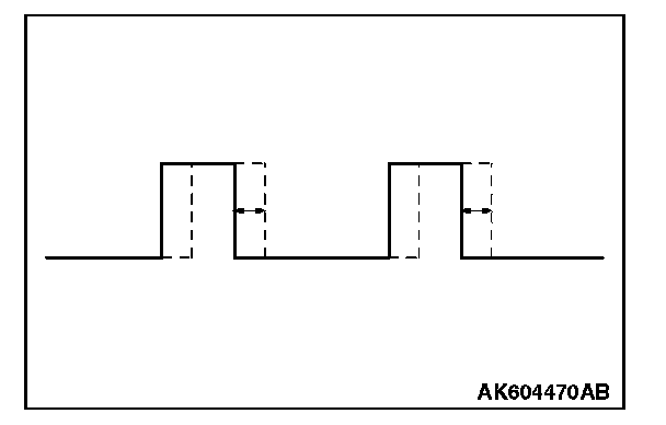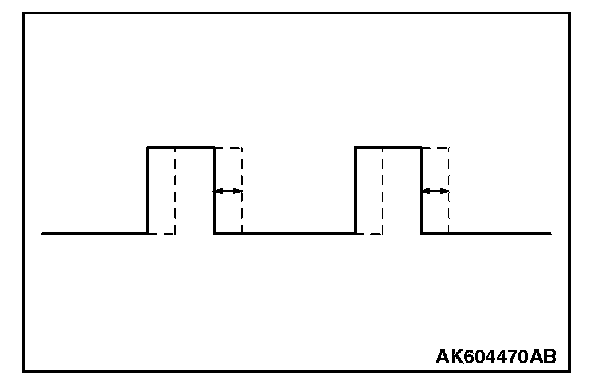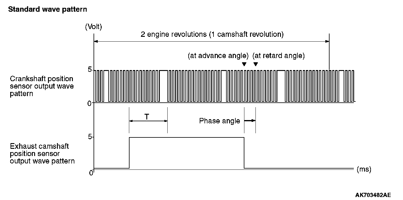 - Verify that, toward the engine speed of 2,500 r/min, time difference T from when the crankshaft position sensor output wave falls to when the exhaust camshaft position sensor output wave falls becomes less.