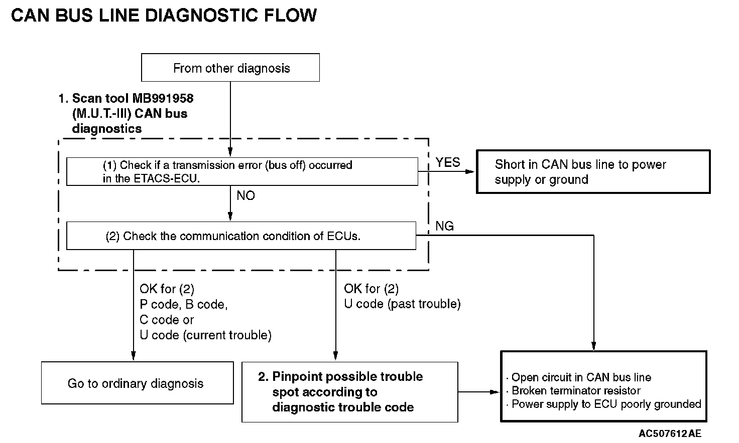 Scan tool MB991958 diagnoses CAN bus lines in accordance with the following strategy.