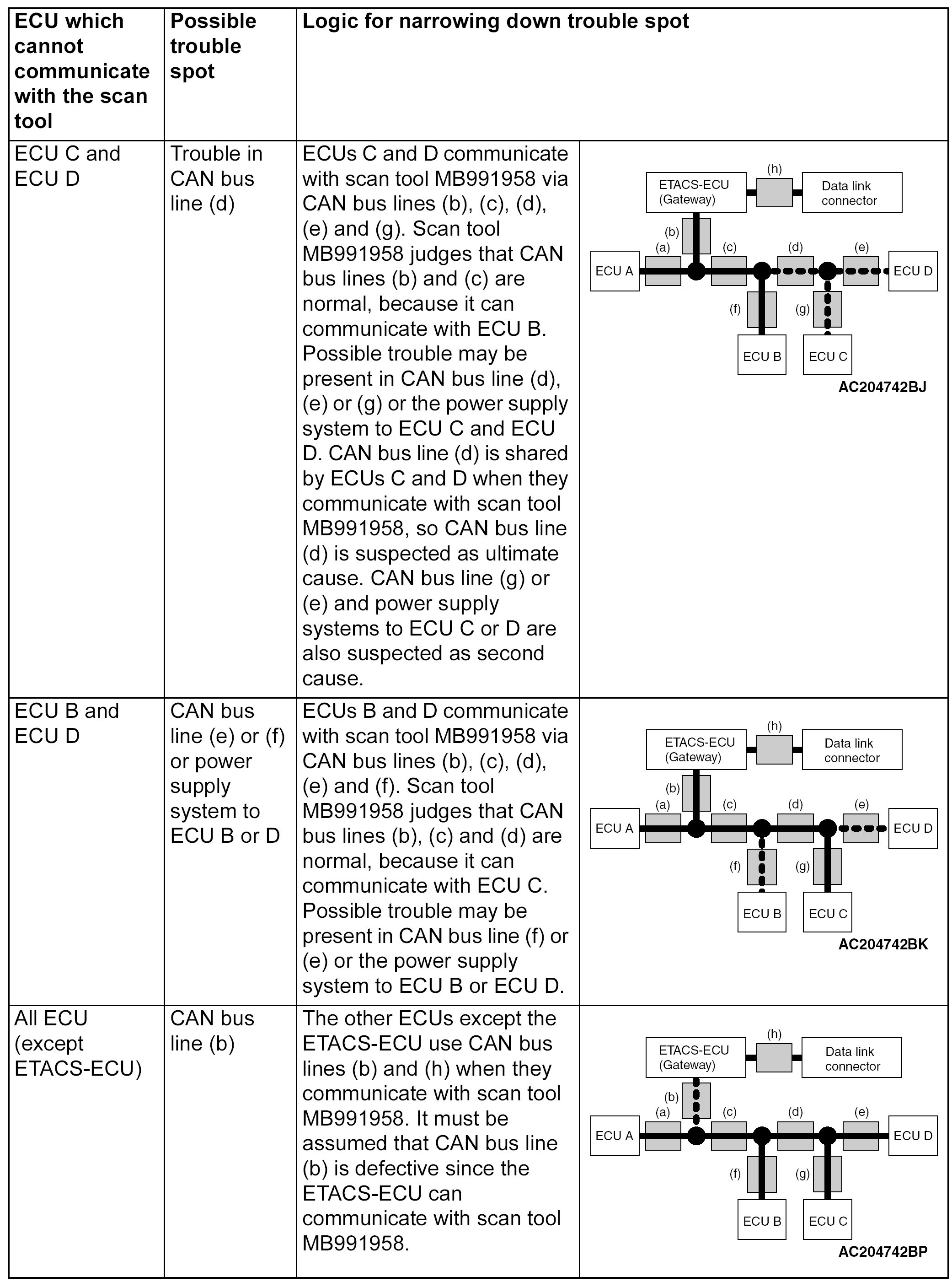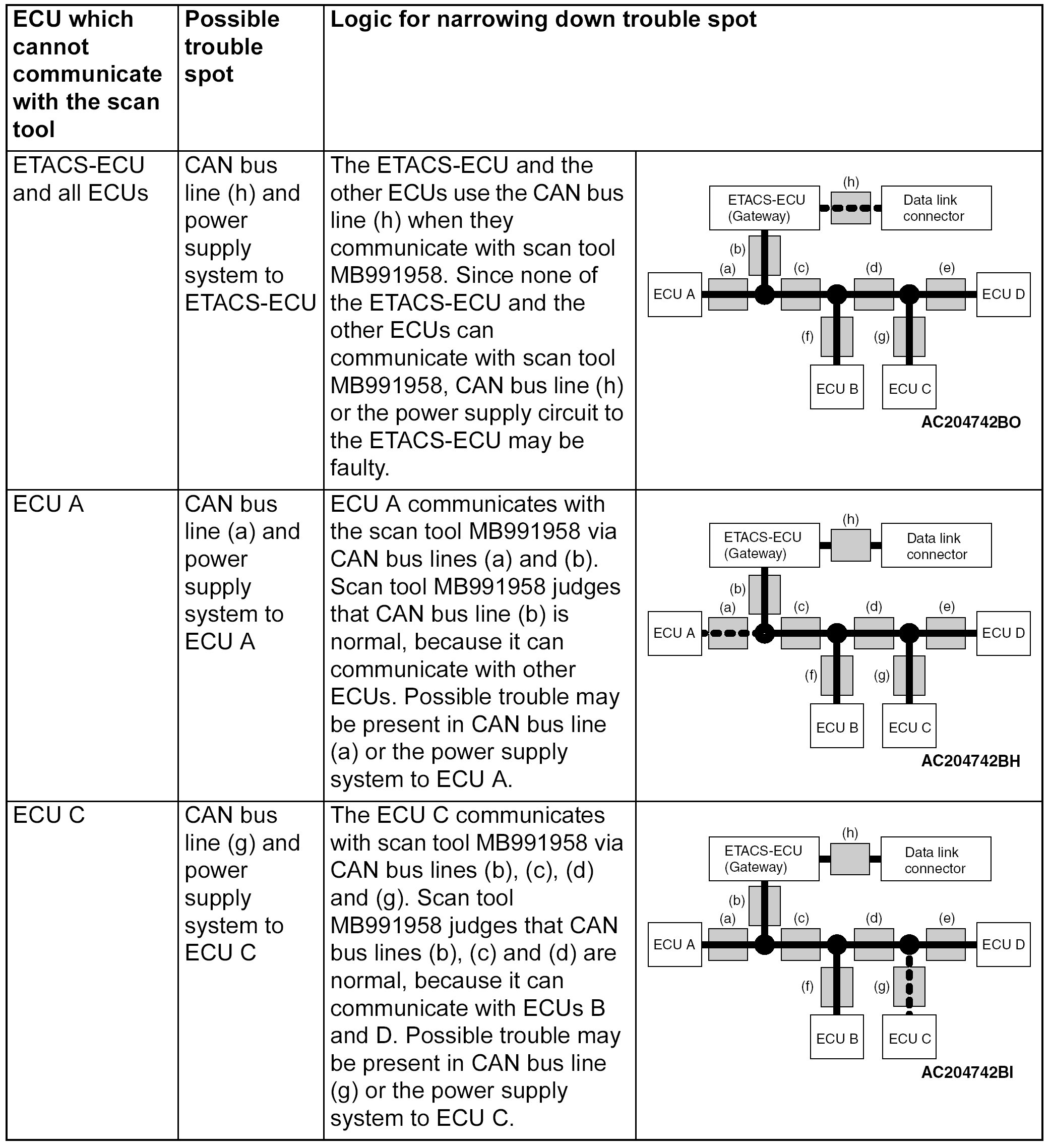 Scan tool MB991958 narrows down troubles in circuit by itself. Its strategies are as follows.