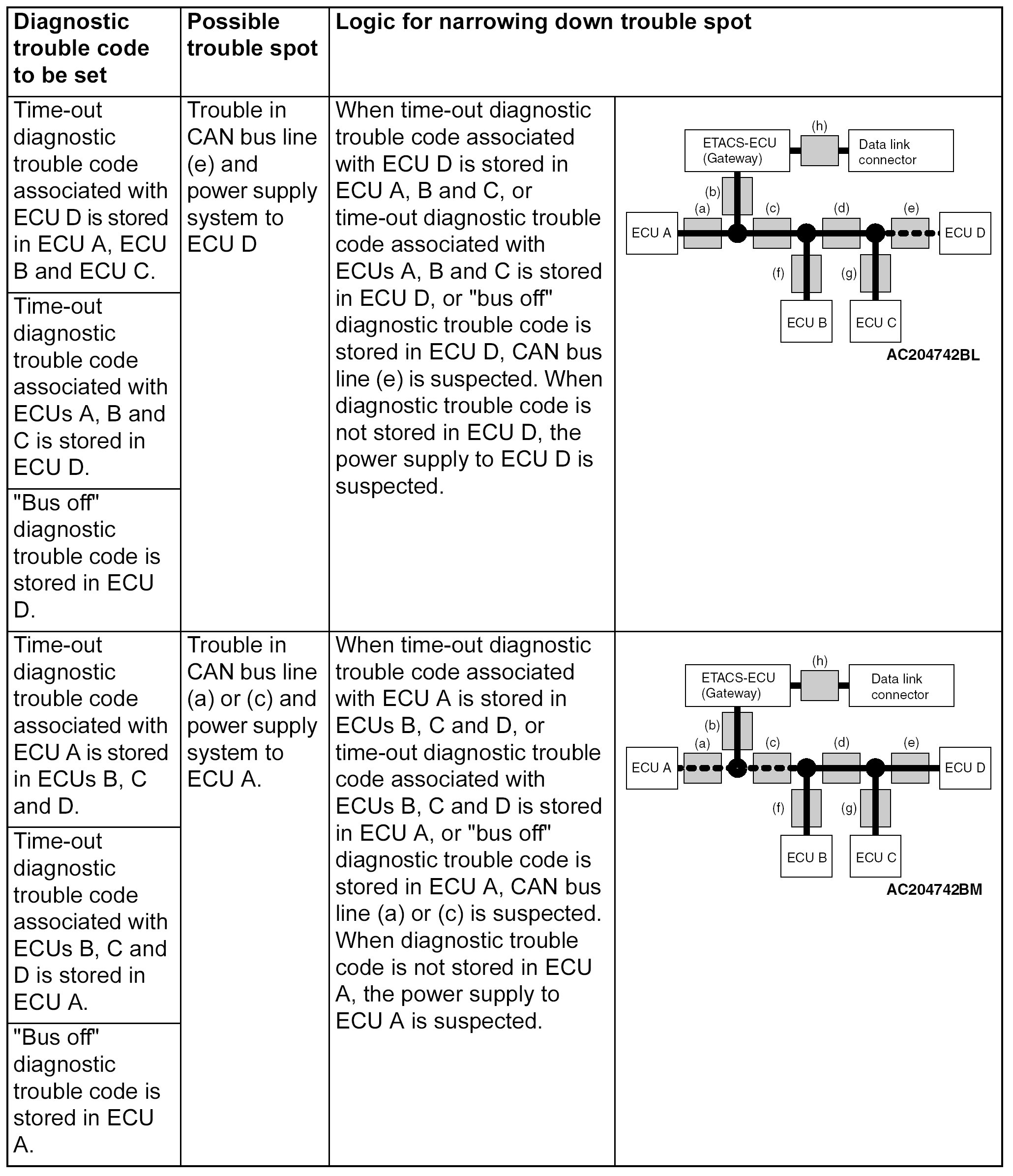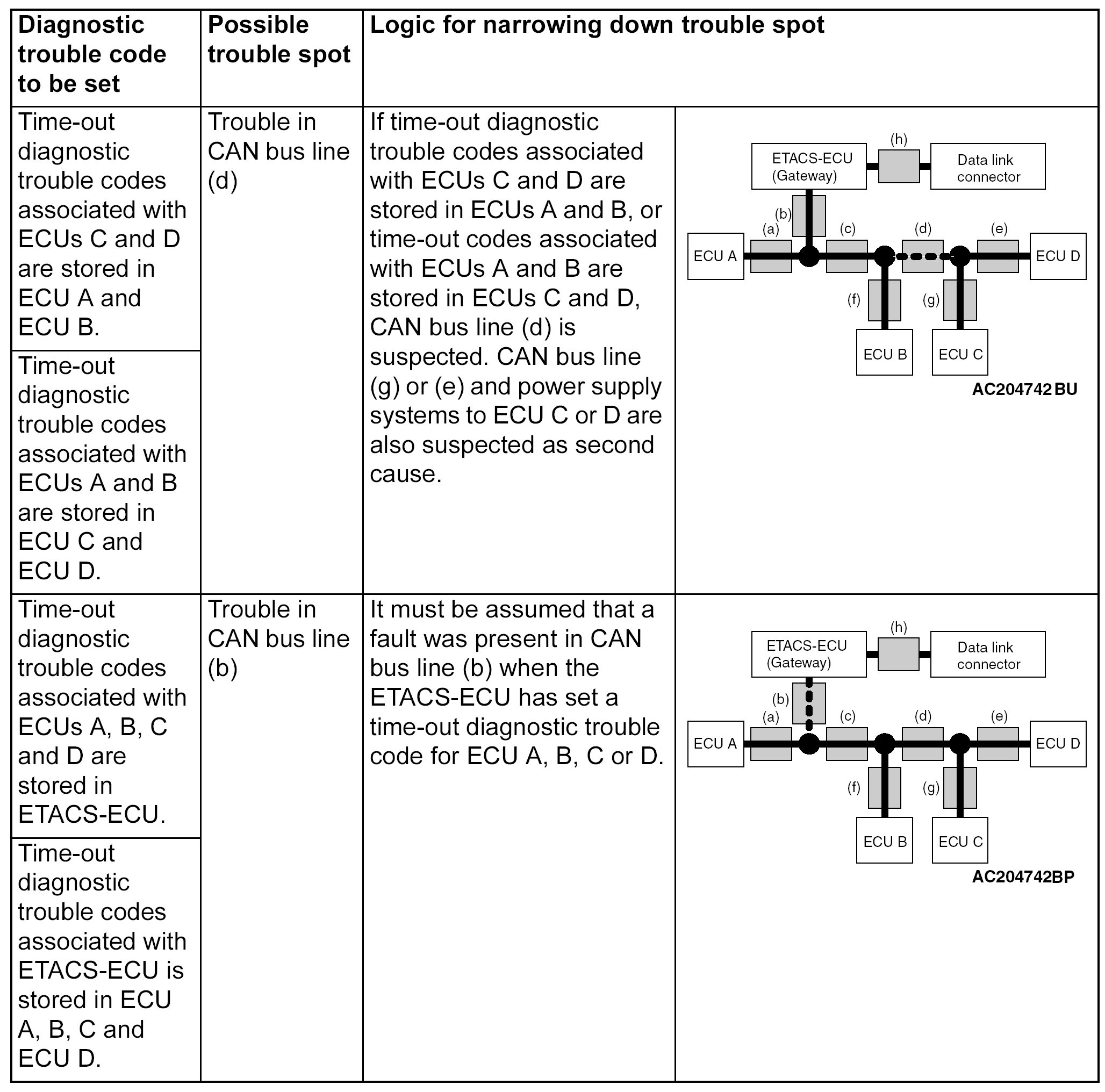NOTE: Time-out diagnostic trouble codes are stored in each ECU memory individually. Therefore, it is possible that these diagnostic trouble codes have not been set simultaneously. If the trouble spot cannot be found when you diagnose by judging from multiple diagnostic trouble codes, check the communication lines between each ECU.