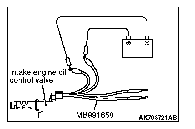 2. Check that the operation sound of the intake engine oil control valve can be heard when the positive battery voltage is supplied to the intake engine oil control valve. (Use the special tool MB991658 to connect terminal No. 2 of the intake engine oil control valve connector to the positive battery terminal and terminal No. 1 to the negative battery terminal.)