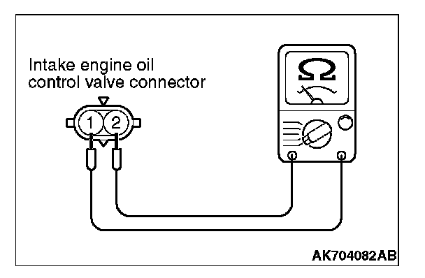 2. Measure resistance between terminal No. 1 and terminal No. 2 of the connector at the intake engine oil control valve side.