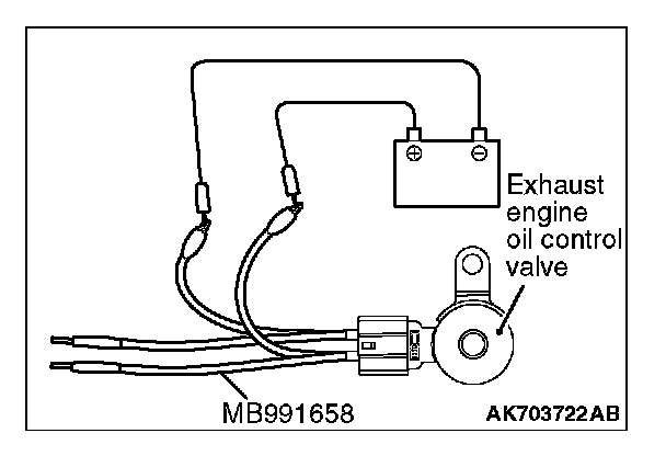 2. Check that the operation sound of the exhaust engine oil control valve can be heard when the positive battery voltage is supplied to the exhaust engine oil control valve. (Use the special tool MB991658 to connect terminal No. 2 of the exhaust engine oil control valve connector to the positive battery terminal and terminal No. 1 to the negative battery terminal.)