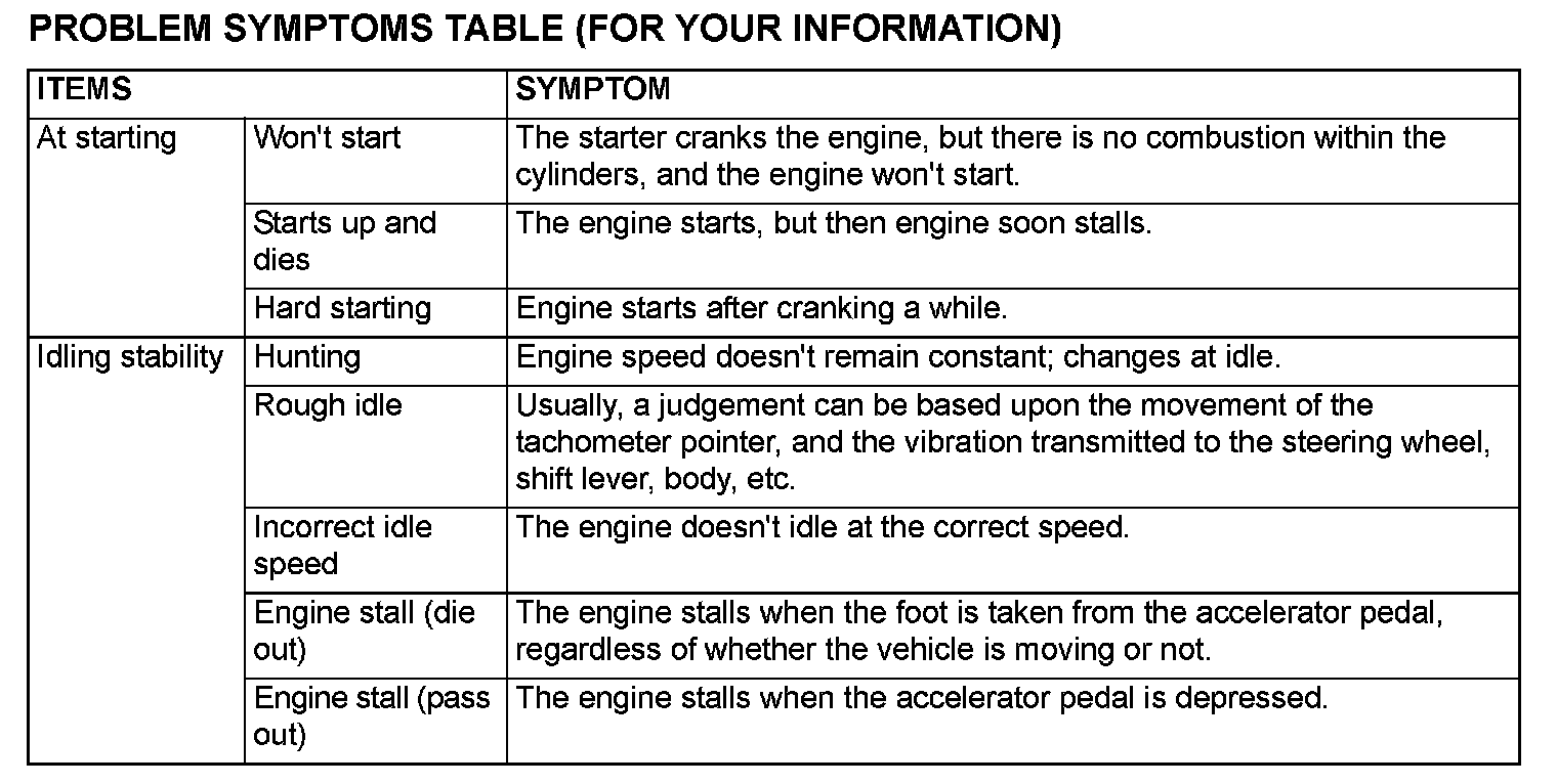 PROBLEM SYMPTOMS TABLE (FOR YOUR INFORMATION)