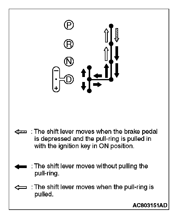 NOTE: Because the misoperation preventive device is equipped, the shift lever cannot be moved out of the P position unless the ignition switch is turned to the position other than LOCK (OFF) and the brake pedal is depressed.