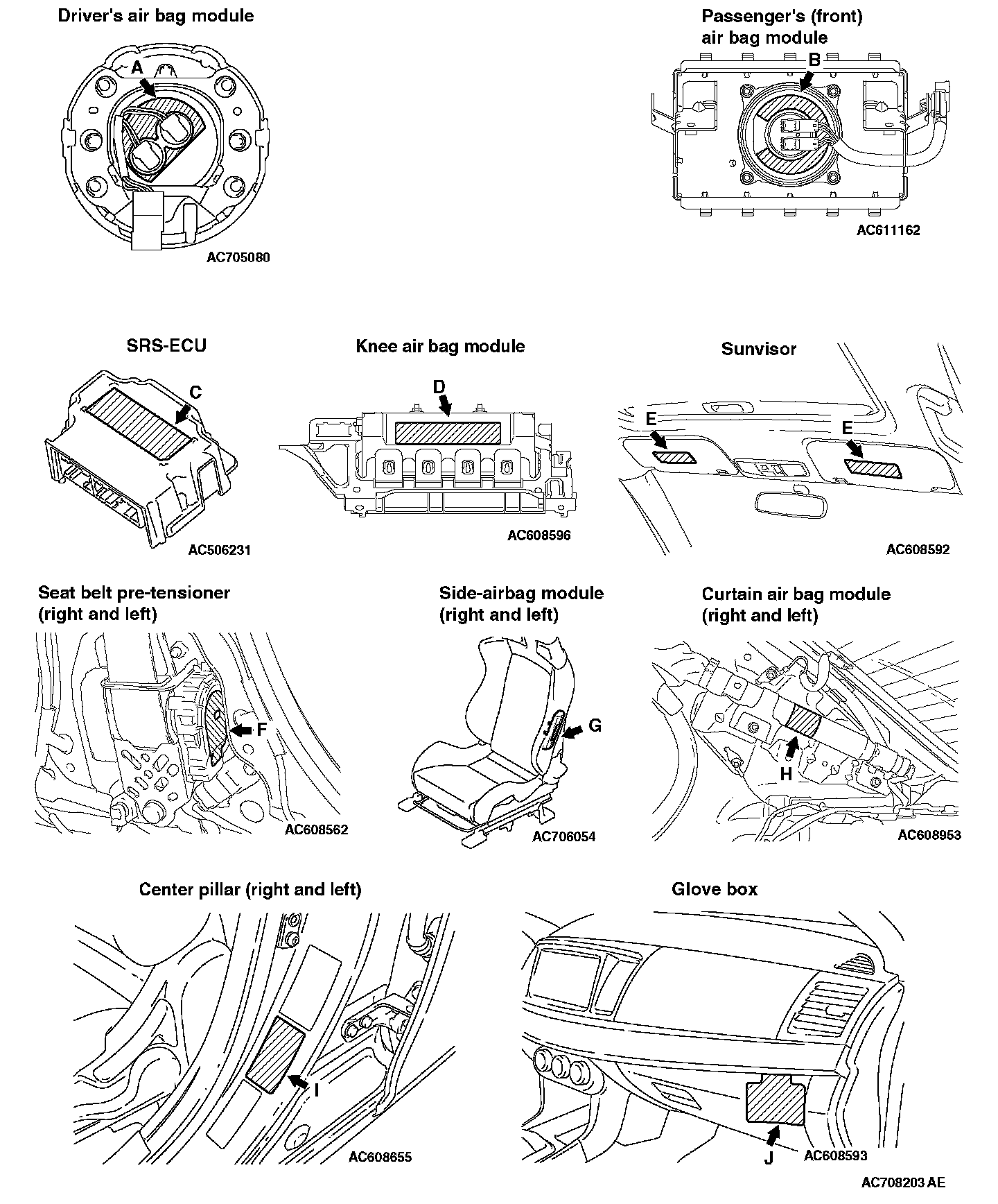 WARNING/CAUTION LABELSA number of caution labels related to the SRS are found in the vehicle, as shown in the following illustrations. Follow label instructions when servicing SRS. The label I is not to be removed except by owner. If the other labels are dirty or damaged, replace them.