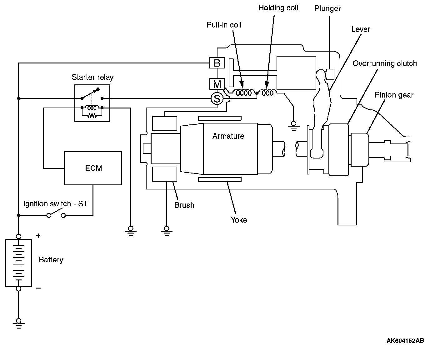 If the ignition switch is turned to the "START" position, current flows in the coil provided inside magnetic switch, attracting the plunger. When the plunger is attracted, the lever connected to the plunger is actuated to engage the starter clutch.