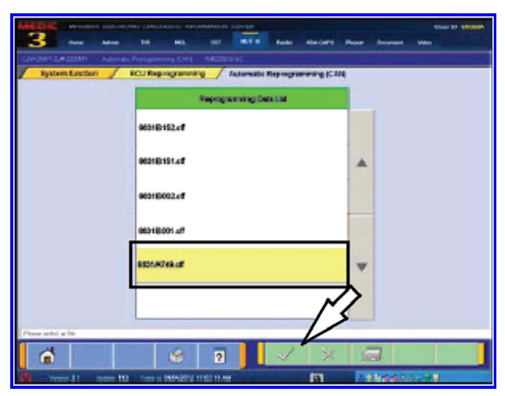 17. Select file 8631A749.cff from the Reprogramming Data List and click the check mark to continue.