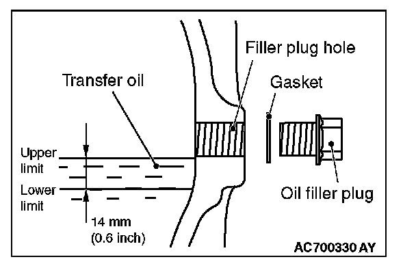 5. If the oil level is not in between the upper limit and the lower limit, refill the specified oil to the bottom of the oil filler plug hole.