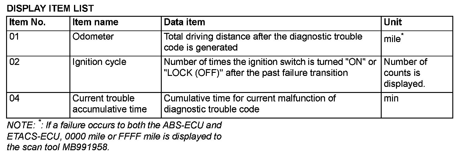 When detecting fault and storing the DTC, the ECU connected to CAN bus line obtains the data before the determination of the DTC and the data when the DTC is determined, and then stores the ECU status of that time. By analyzing each data from scan tool, the troubleshooting can be performed more efficiently. The displayed items are as the table below.