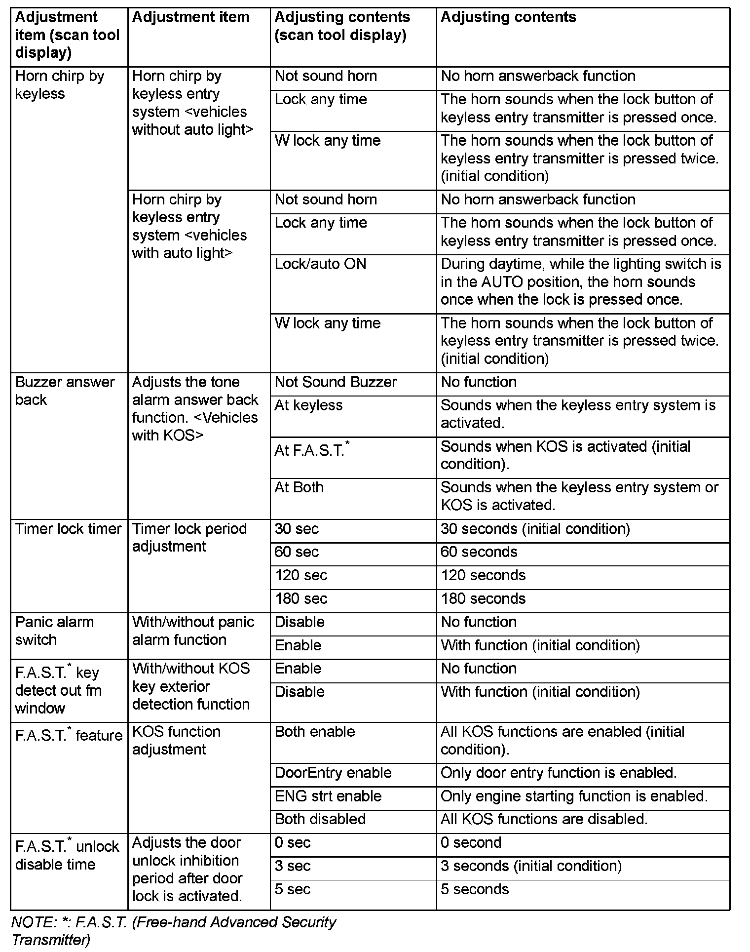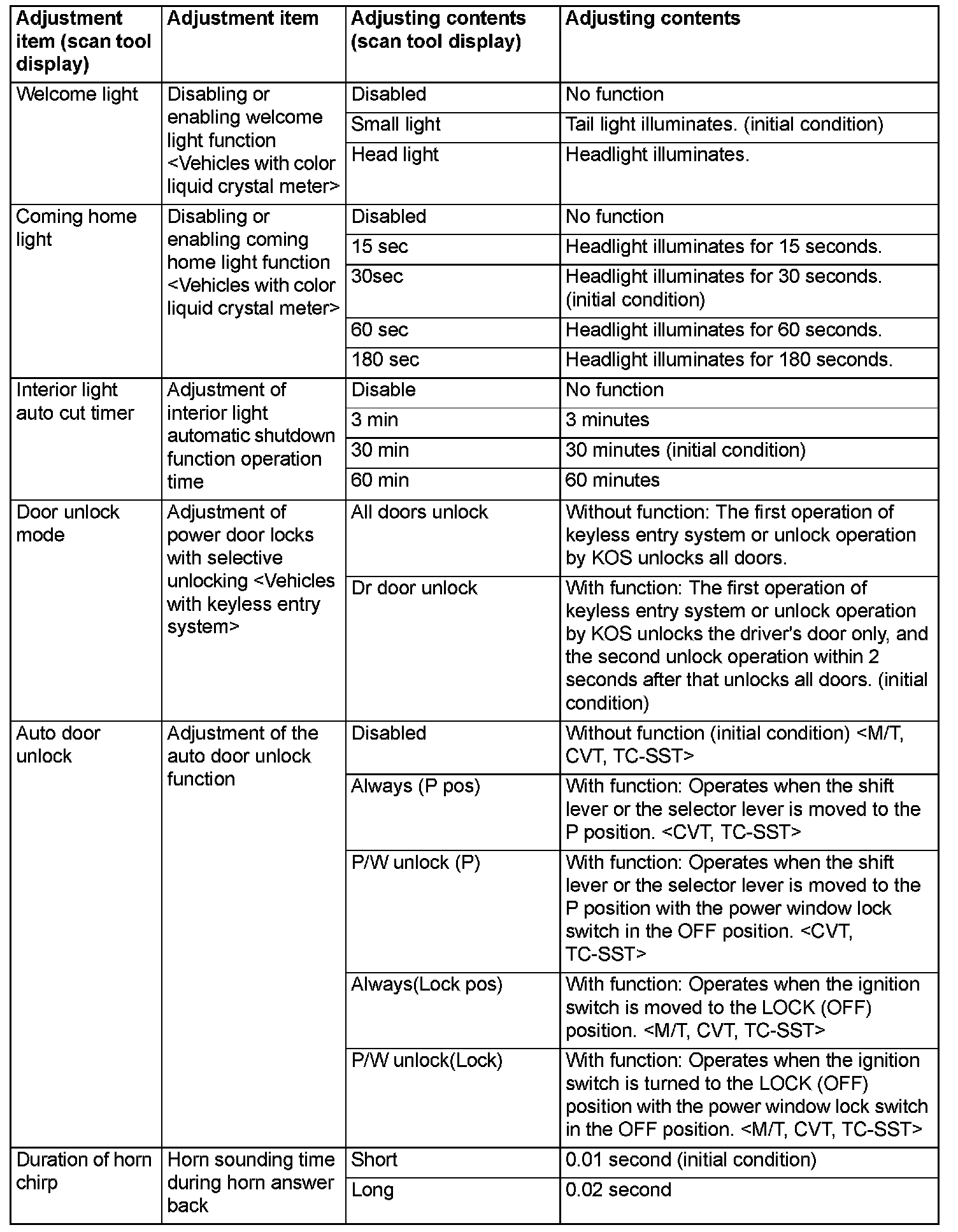 By operating the ETACS system or MMCS of scan tool MB991958, the following functions can be programmed. The programmed information is held even when the battery is disconnected.