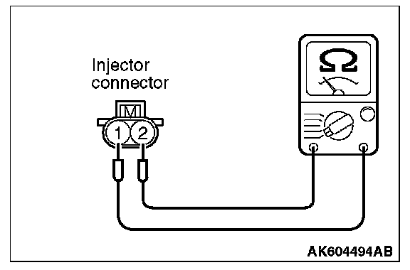 2. Measure the resistance between injector side connector terminals 1 and 2.