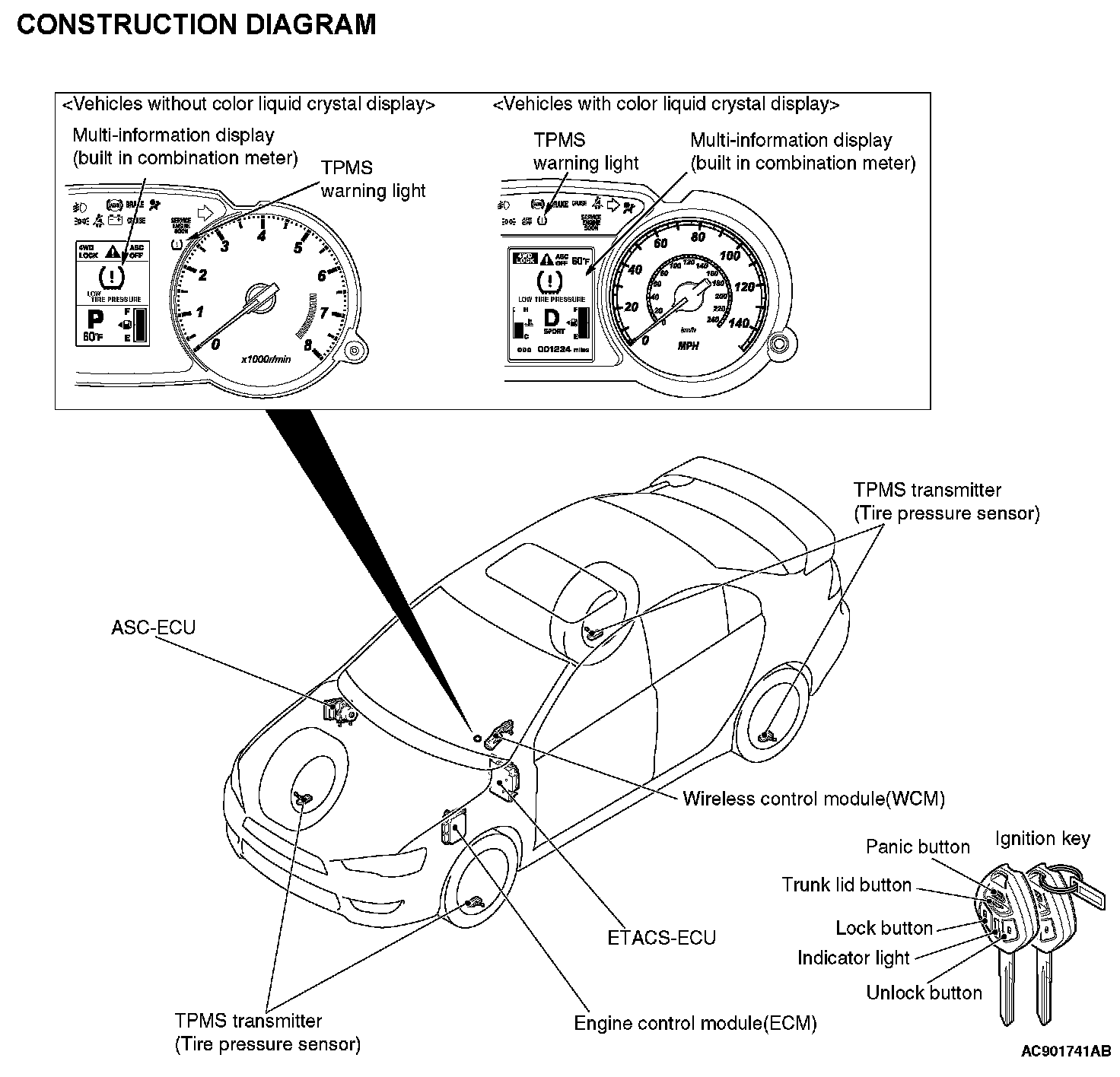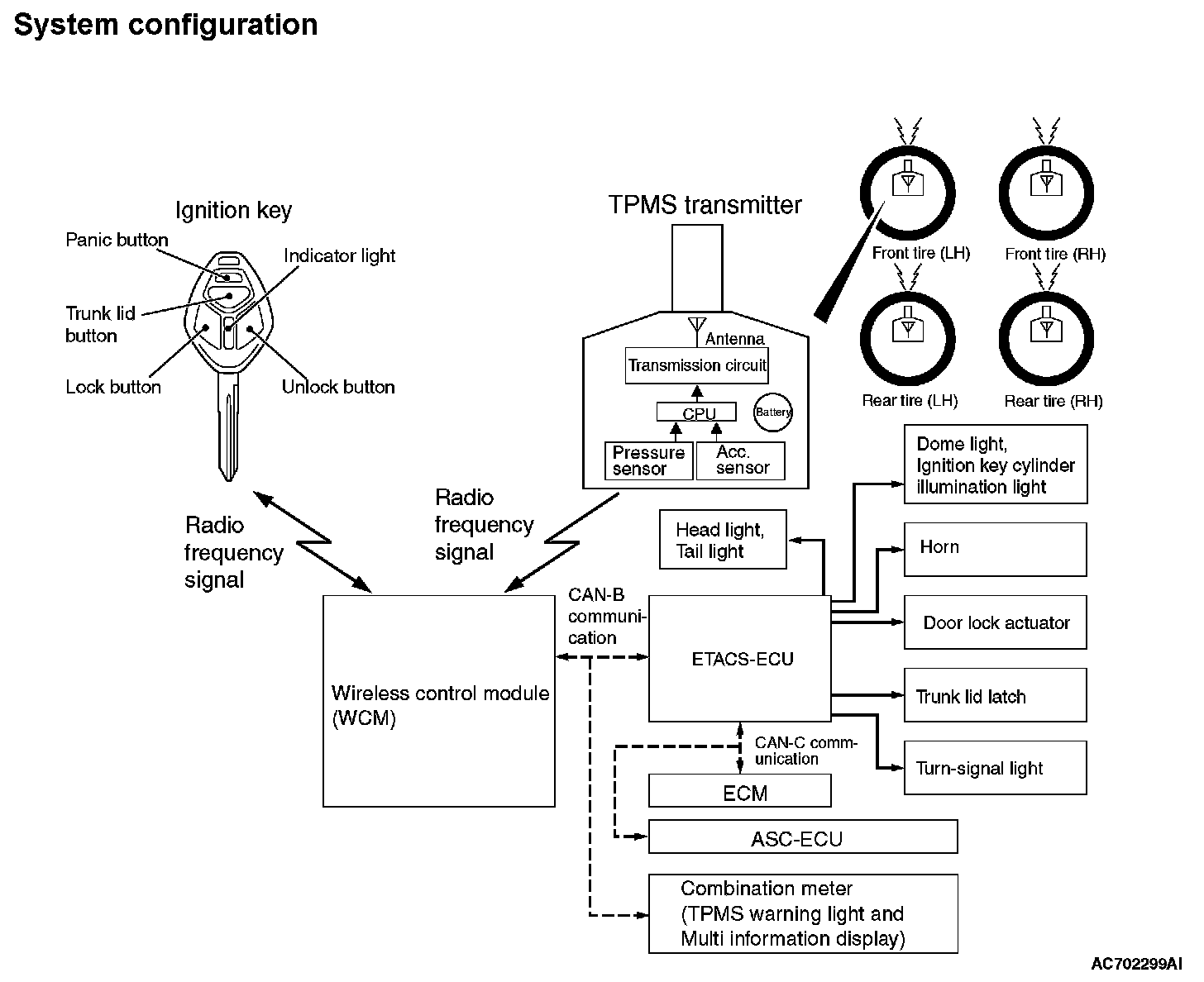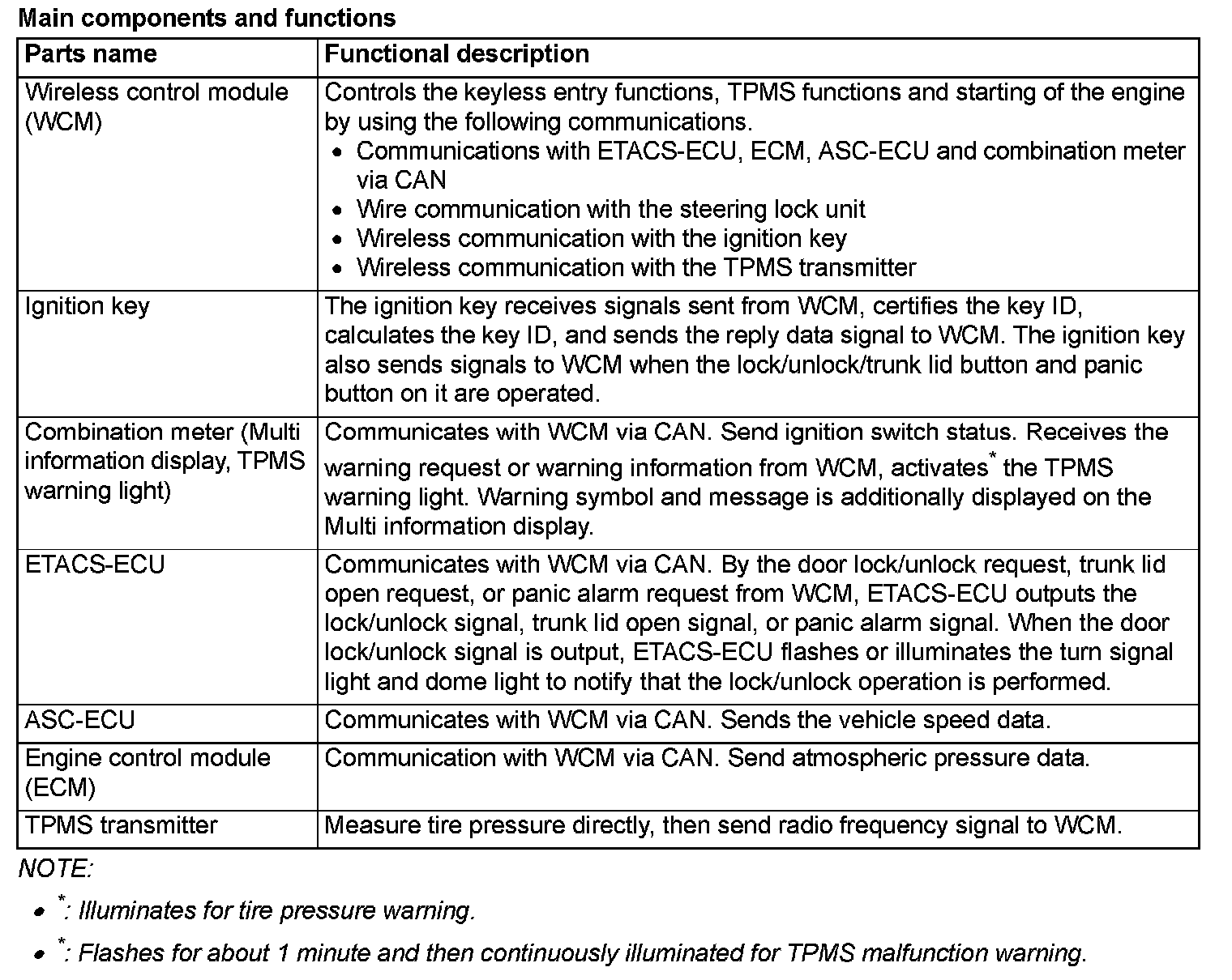 The wireless control module (WCM) is a system that integrates the keyless entry function with which remote operation (opening/closing of all doors, opening of trunk lid, and warning function to warn a person who intends to damage the vehicle*) can be performed by operating the lock/unlock /trunk lid button or panic button on the ignition key (transmitter). Also, WCM incorporates the immobilizer function, which prohibits the starting of engine using an unauthorized key, and the tire pressure monitoring system (TPMS), which issues a warning to a driver by illuminating or flashing the warning light if an abnormality to the tire pressure or system is detected. WCM has the following features: