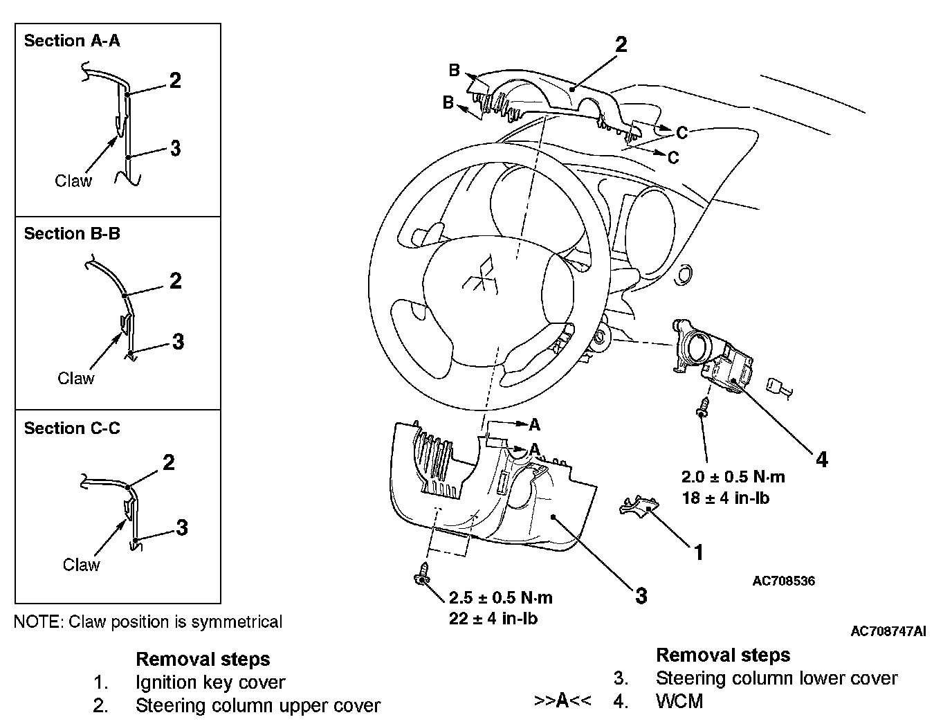 ]]A[[ WCM INSTALLATION Check that the top claw of WCM is fixed securely to the boss of steering lock and the antenna is not floated on the key cylinder.