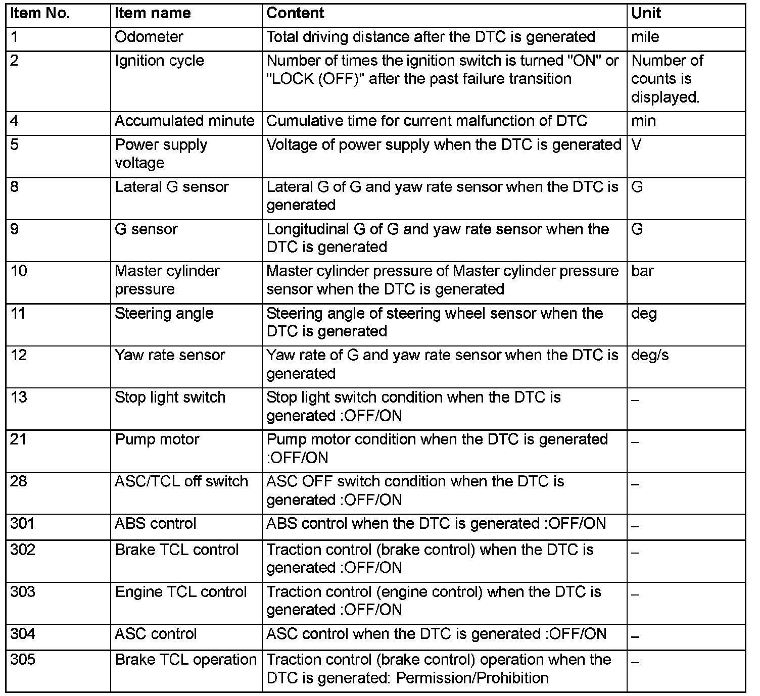 When detecting fault and storing the DTC, the ECU connected to CAN bus line obtains the data before the determination of the DTC and the data when the DTC is determined, and then stores the ECU status of that time. By analyzing each data from scan tool, the troubleshooting can be performed more efficiently. The displayed items are as the table below.