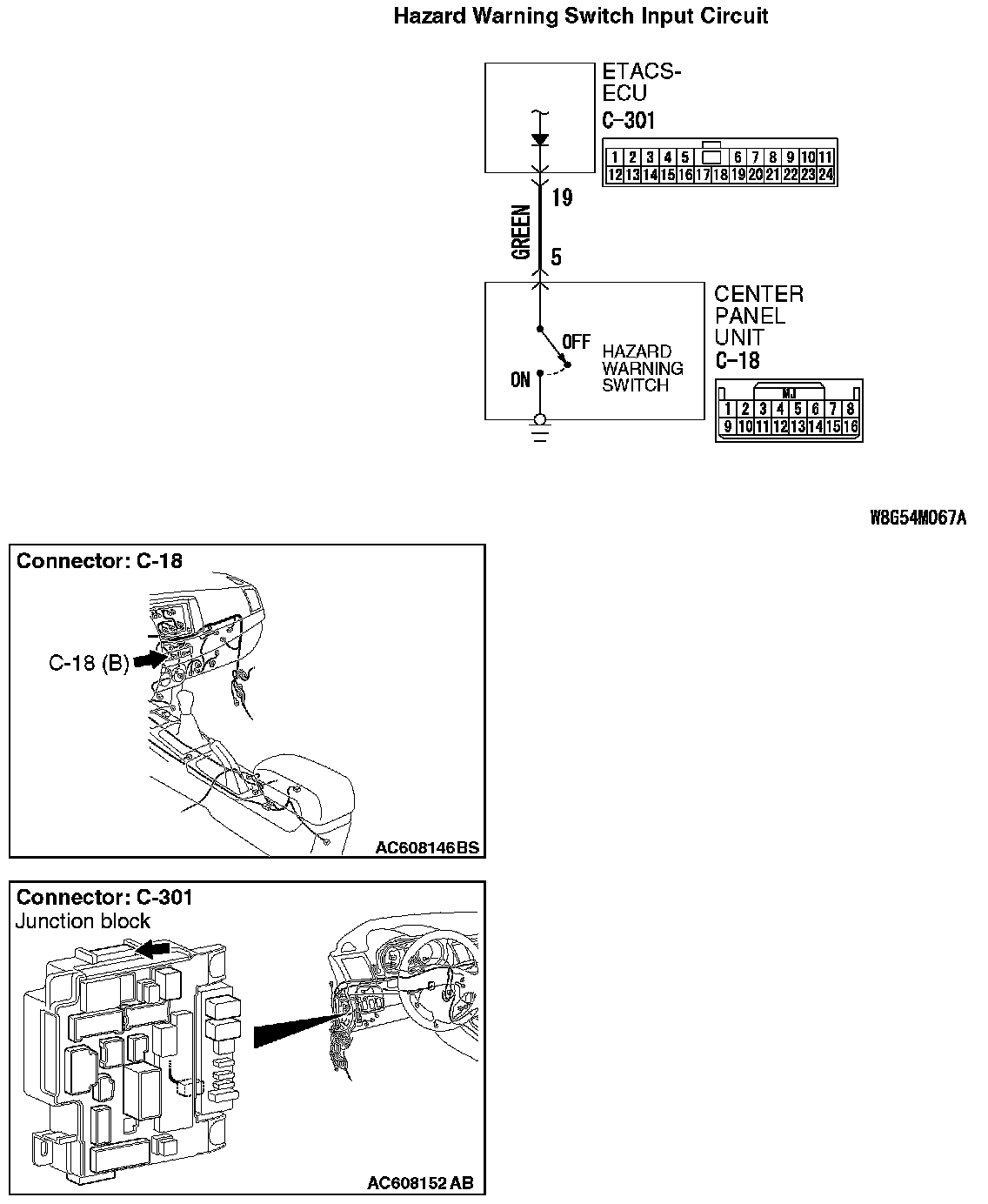 Inspection Procedure 10: ETACS-ECU does not receive any signal from the hazard warning light switch.Hazard Warning Switch Input Circuit: