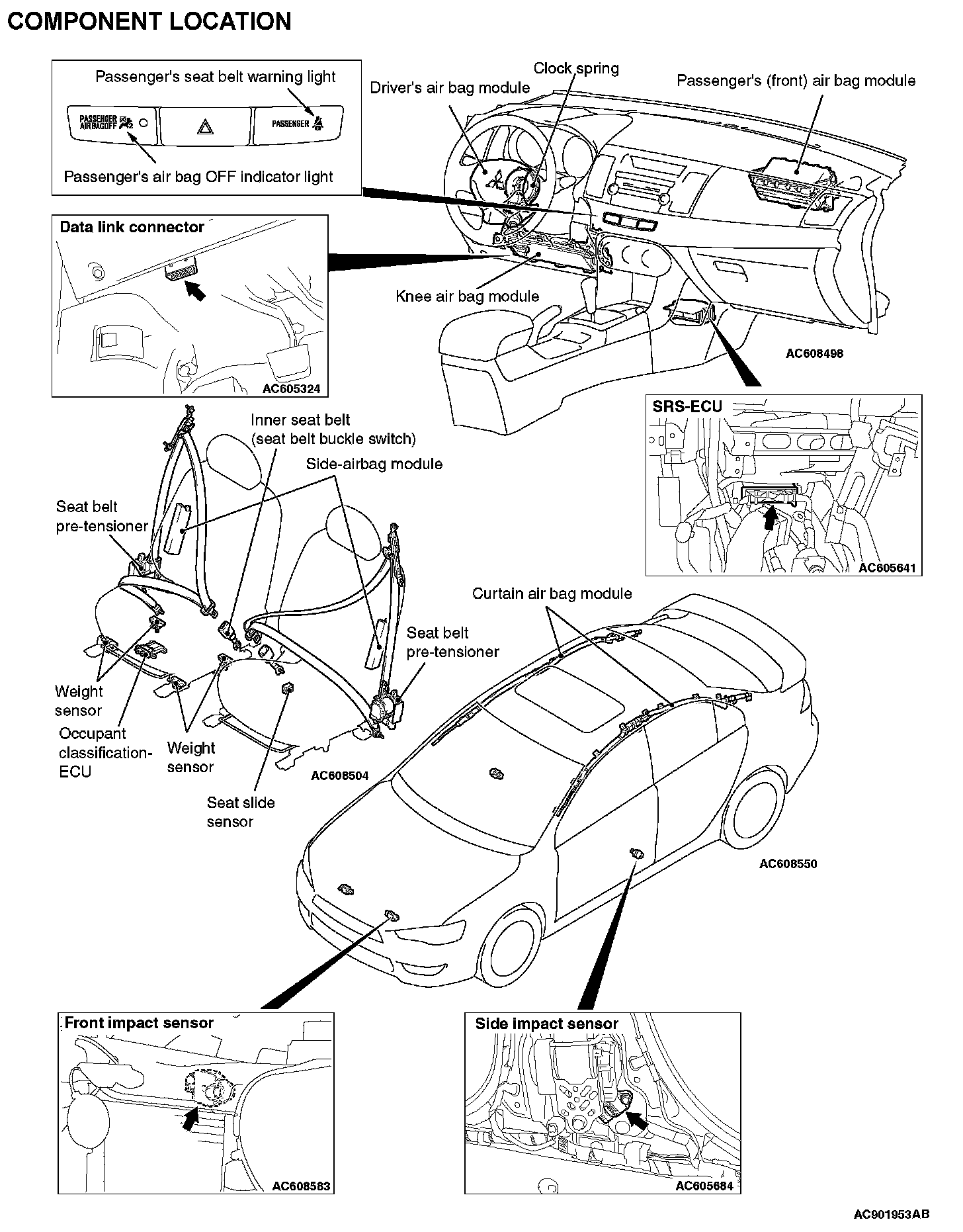 NOTE: The illustration above shows the front impact sensor (LH) and the side impact sensor (LH). The position of the front impact sensor (RH) and the side impact sensor (RH) is symmetrical to this.
