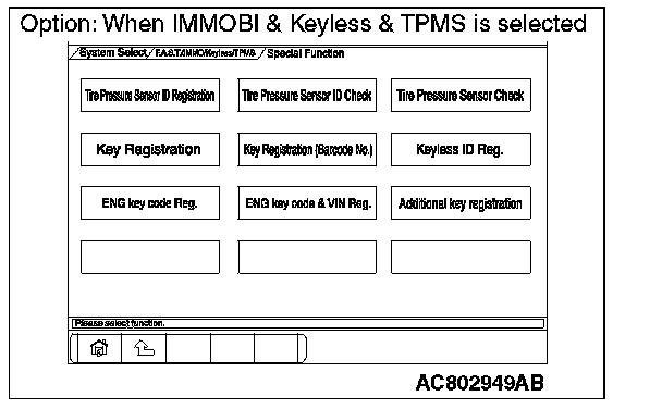 8. Select "F.A.S.T./IMMO/Keyless/TPMS" button from the "System Select" screen. Then, select the applicable option code item and push the OK button.