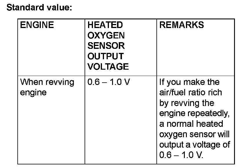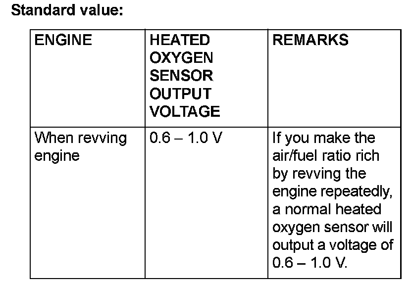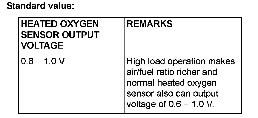 - If the temperature of sensing area does not reach the high temperature [of approximately 400 °C (752 °F) or more] even though the heated oxygen sensor is normal, the output voltage would be possibly low in spite of the rich air-fuel ratio.
