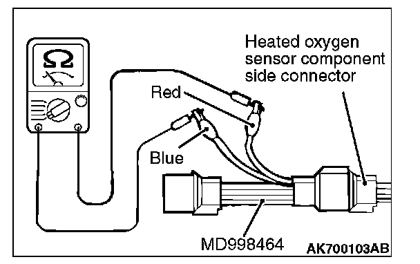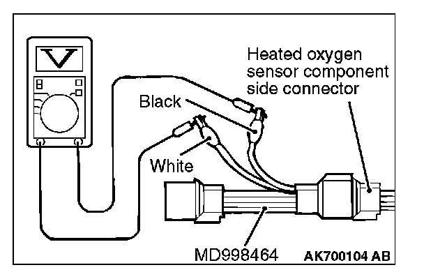 1. Disconnect the heated oxygen sensor connector and connect special tool MD998464 to the connector on the heated oxygen sensor side.