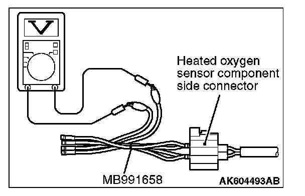 1. Disconnect the heated oxygen sensor connector and connect special tool MB991658 to the connector on the heated oxygen sensor side.