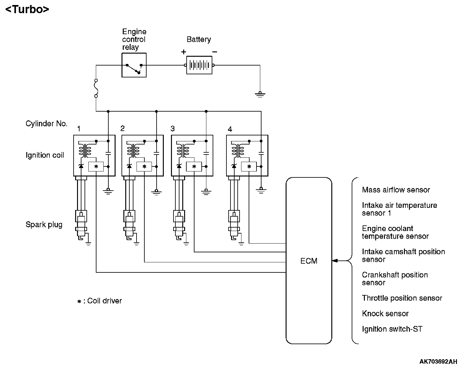 The ECM determines which ignition coil should be controlled by means of the signals from the camshaft position sensor and the crank angle sensor. It also detects the crankshaft position, in order to provide ignition at the most appropriate timing in response to the engine operation conditions.