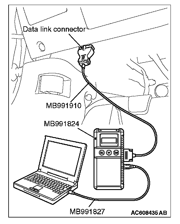 CAUTION: To prevent damage to scan tool MB991958, always turn the ignition switch to the "LOCK" (OFF) position before connecting or disconnecting scan tool MB991958.