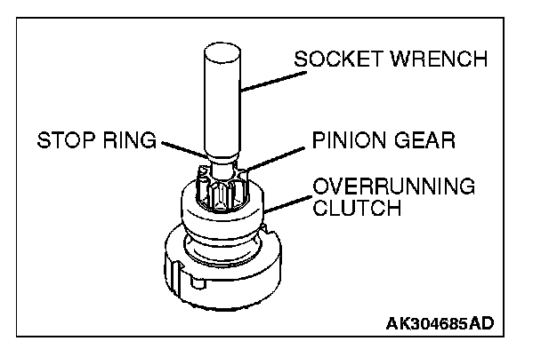 1. Apply a long socket wrench of an appropriate size to the stop ring and strike the wrench to drive out the stop ring toward the pinion gear side.