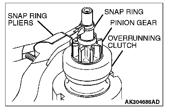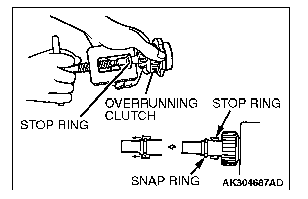 2. Remove the snap ring with snap ring pliers, then remove the stop ring and overrunning clutch.