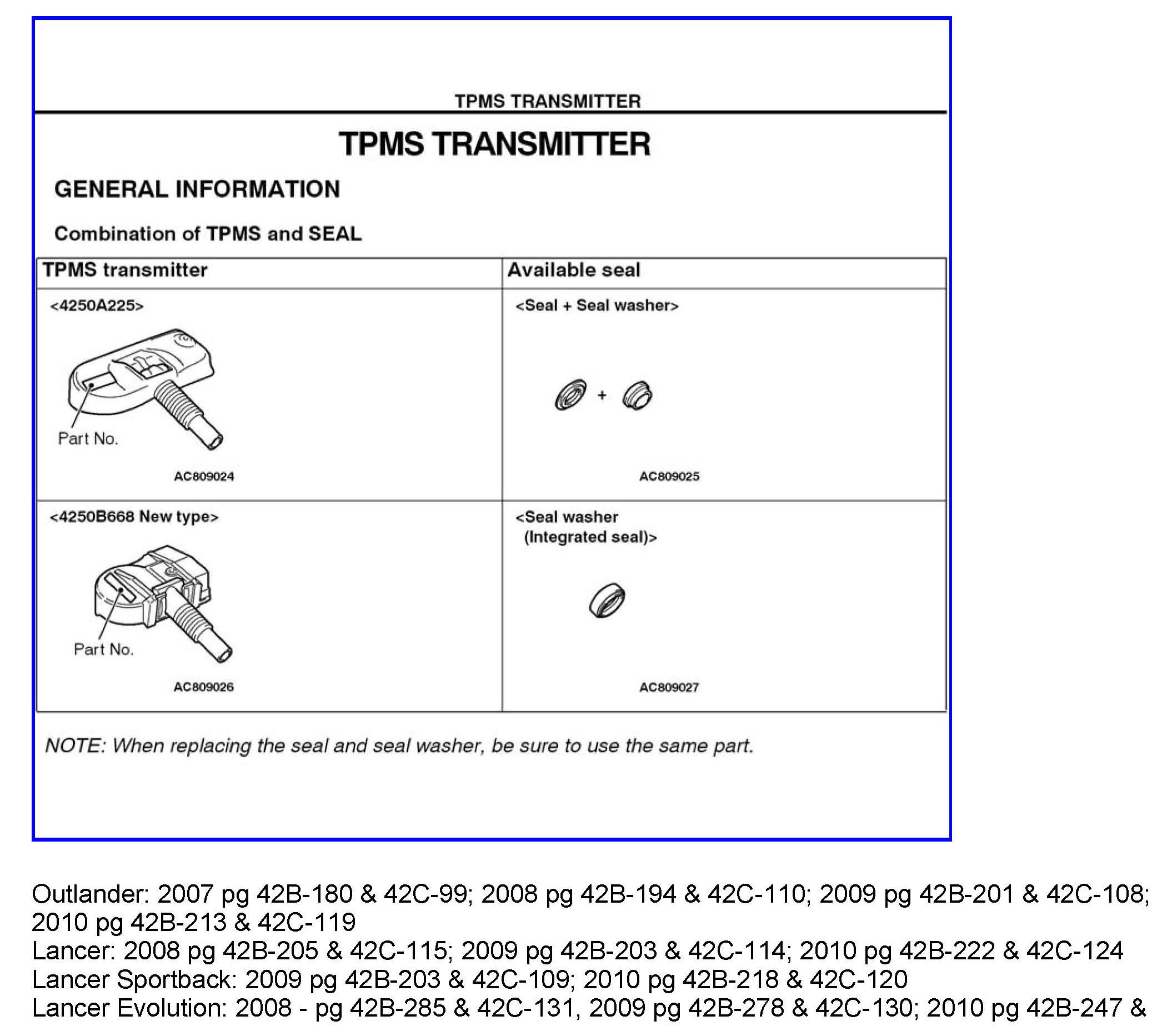 A new type of Tire Pressure Monitor System (TPMS) transmitter is installed on affected vehicles produced after mid-July 2009. Removal and installation procedures for the new TPMS transmitter (p/n 4250B668) are different than for the previous transmitter (p/n 4250A225).