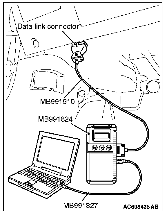 To prevent damage to scan tool MB991958, always turn the ignition switch to the "LOCK" (OFF) position before connecting or disconnecting scan tool MB991958.