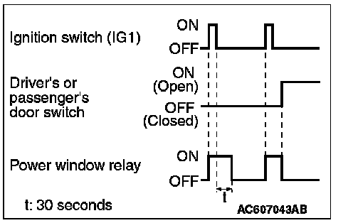 Even after the ignition is switched off, the ETACS-ECU keeps the power window relay activated for approximately 30 seconds, enabling raising or lowering of the power windows by using the power window switches. After approximately 30 seconds, the power window relay is deactivated.