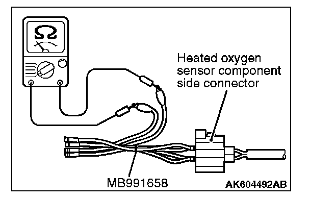 1. Disconnect the heated oxygen sensor connector and connect special tool MB991658 to the connector on the heated oxygen sensor side.