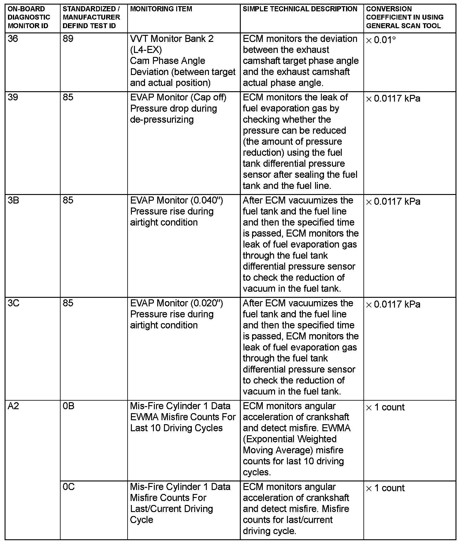 - When the monitored test results are erased by the battery disconnection and so on, the ECM outputs the values in hexadecimal of "0000" or "FFFF", otherwise it outputs abnormal values and so on. In case of this, the ECU outputs are handled as invalid-values. When the first monitor (Readiness Status) is completed after this, the ECM outputs the valid-values.