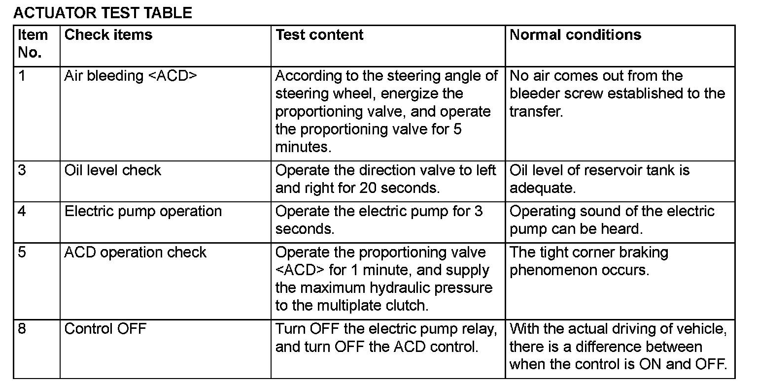 Since the fluid in the hydraulic unit will be hardened under low temperature, all the inspection items in the table may not be checked properly. Therefore, completely remove snow and ice from the hydraulic unit and leave the vehicle under temperature of 0°C (32°F) or higher for 4 hours or more before performing the actuator test.