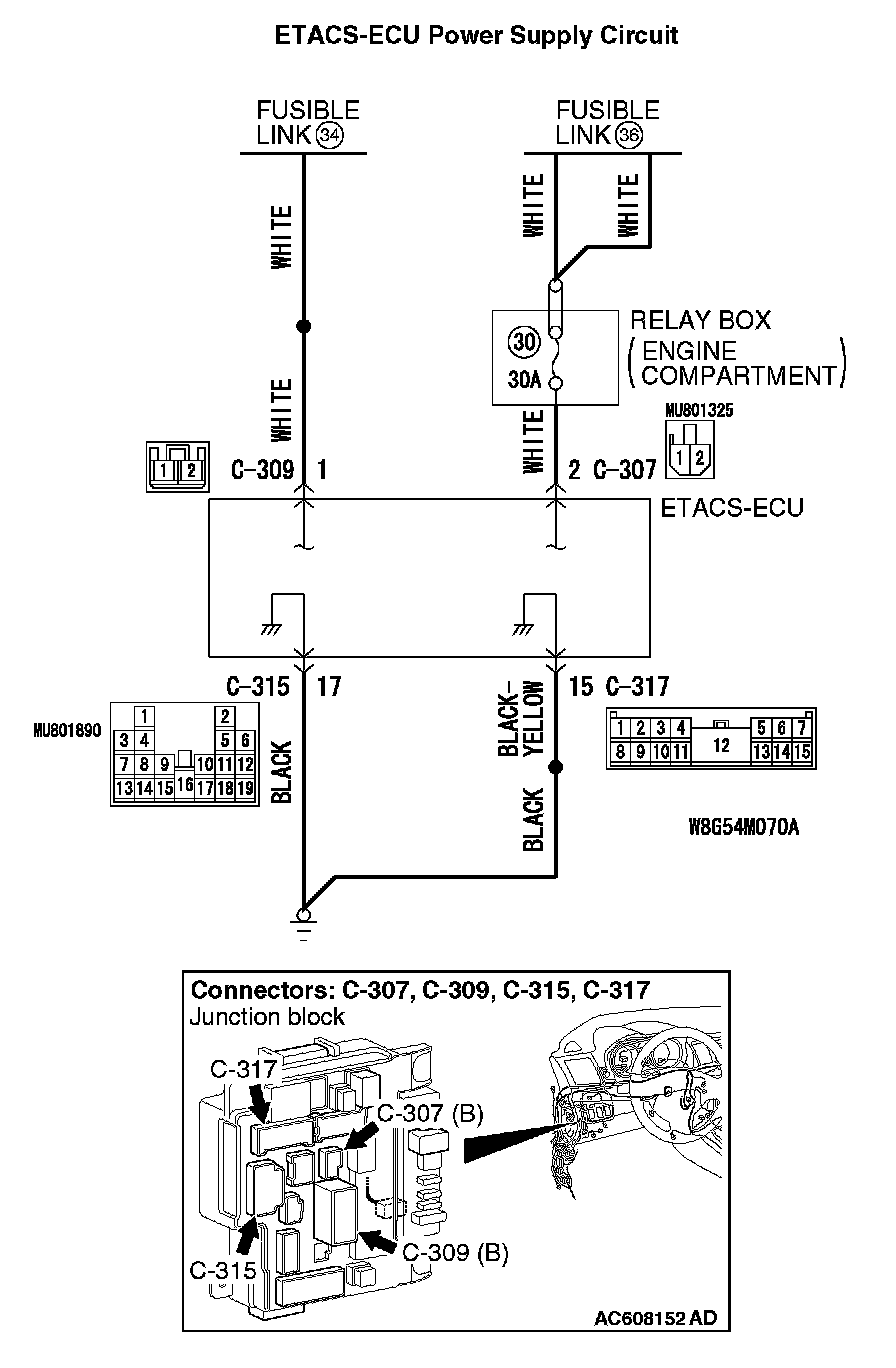 1. Disconnect ETACS-ECU connectors C-307 and C-309 measure the voltage available at the wiring harness side of the connector.