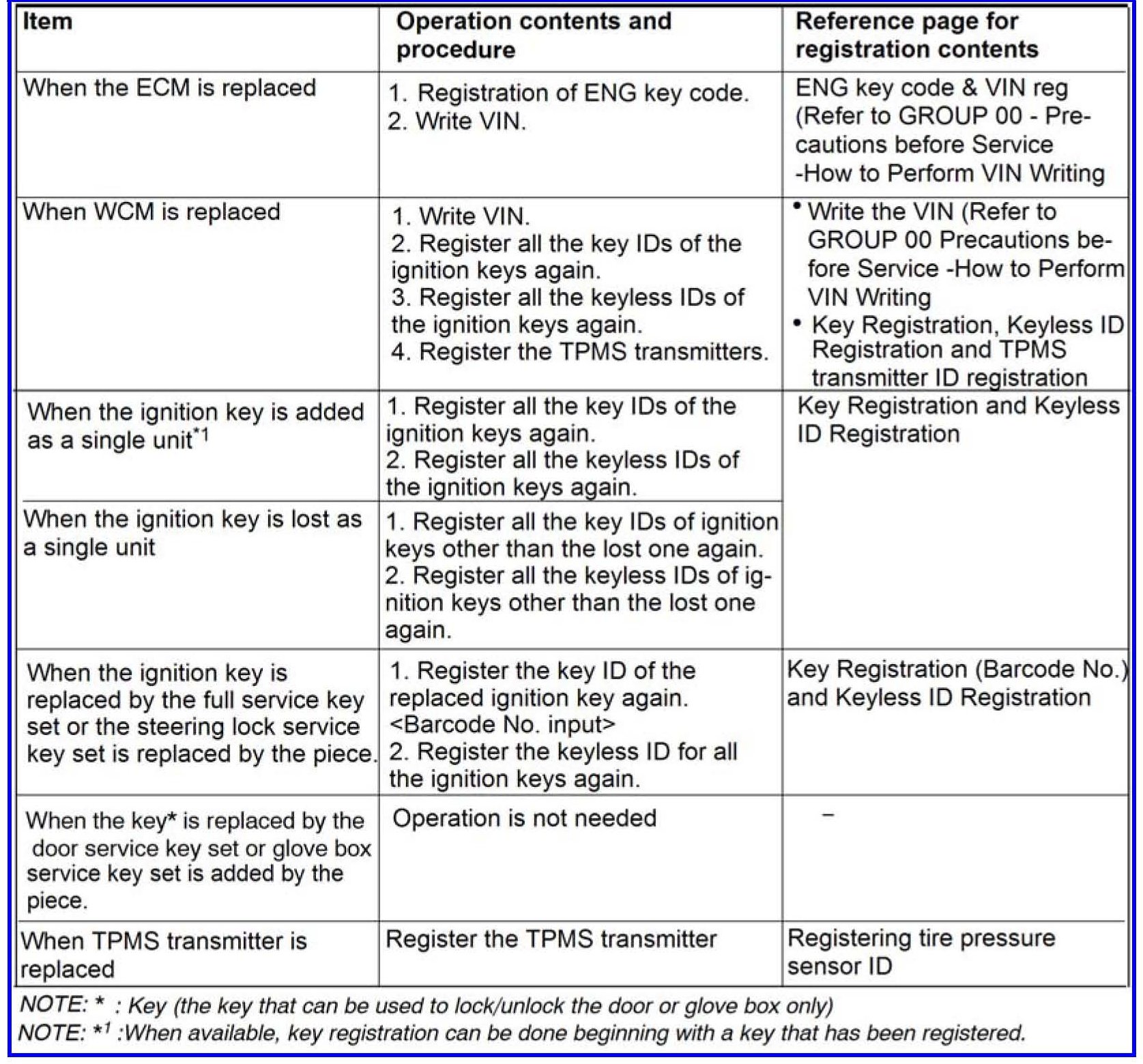 The transponder (a small transmitter) in the ignition key, WCM, and the ECM have their own ID codes stored in them. When the cases listed in the table below occur, the ID codes must be registered in the WCM or ECM again.