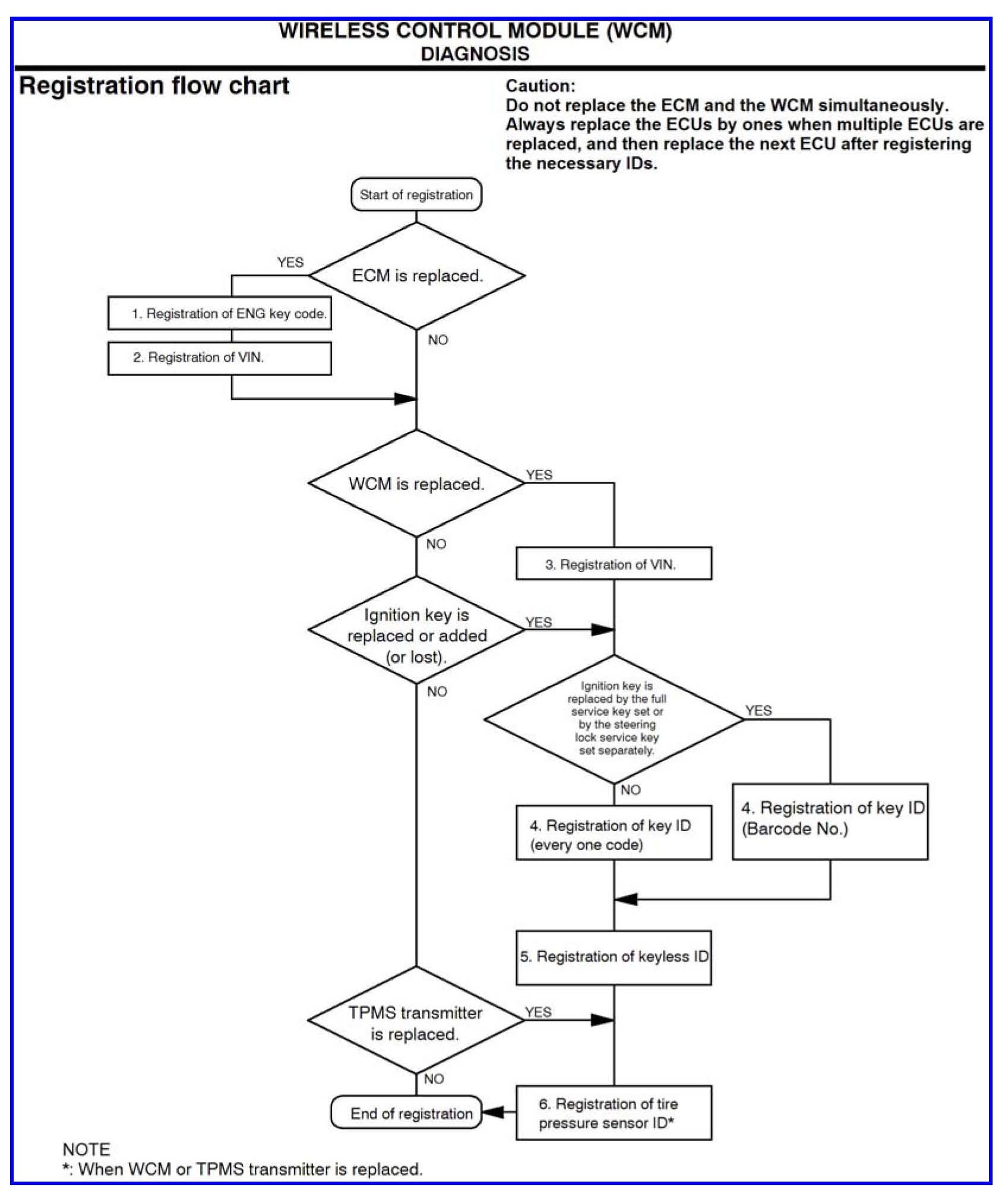 CAUTION: Do not replace the engine control module (ECM) and WCM at the same time. When replacing several ECUs, always replace one ECU at a time, register the necessary IDs in it, and then replace the next ECU.