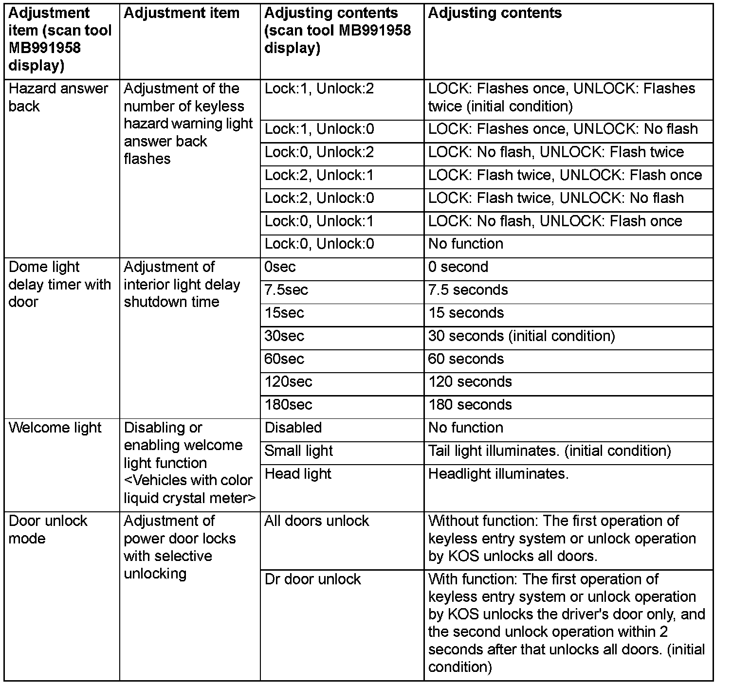 By operating the ETACS system or MMCS of scan tool MB991958, the following functions can be programmed. The programmed information is held even when the battery is disconnected.