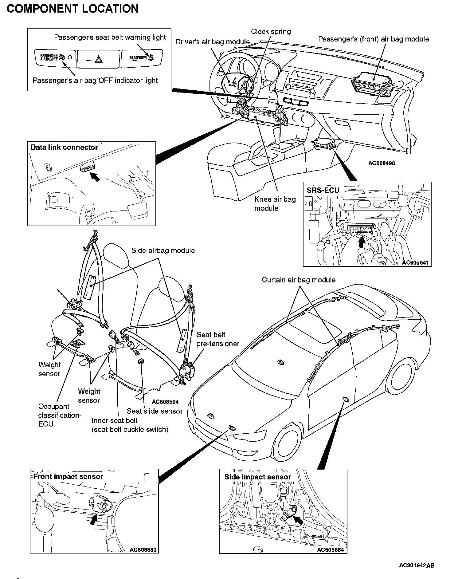 NOTE: The illustration above shows the front impact sensor (LH) and the side impact sensor (LH). The position of the front impact sensor (RH) and the side impact sensor (RH) is symmetrical to this.