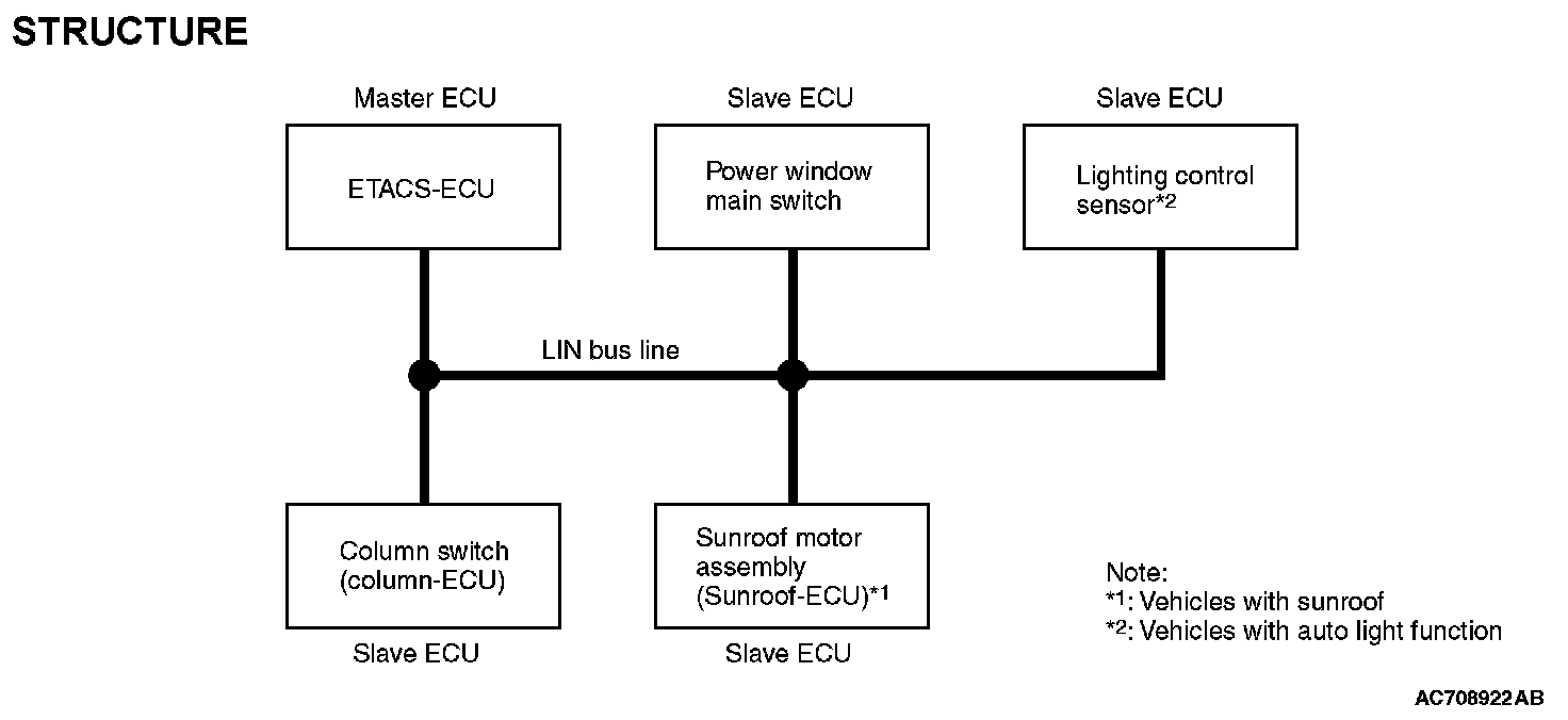 Master and slave ECUs are connected to the LIN bus lines. The master ECU is the ETACS*1-ECU, and the slave ECUs are the column switch (column-ECU), the power window main switch, the sunroof-ECU*2 and the lighting control sensor*3. The master ECU requests these slave ECUs to communicate each other via communication lines.