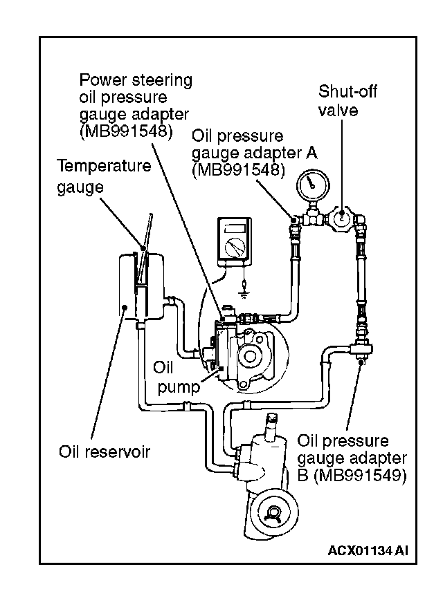 1. Disconnect the pressure hose from the oil pump, and then connect the special tools MB991548, MB990662 and MB991549.