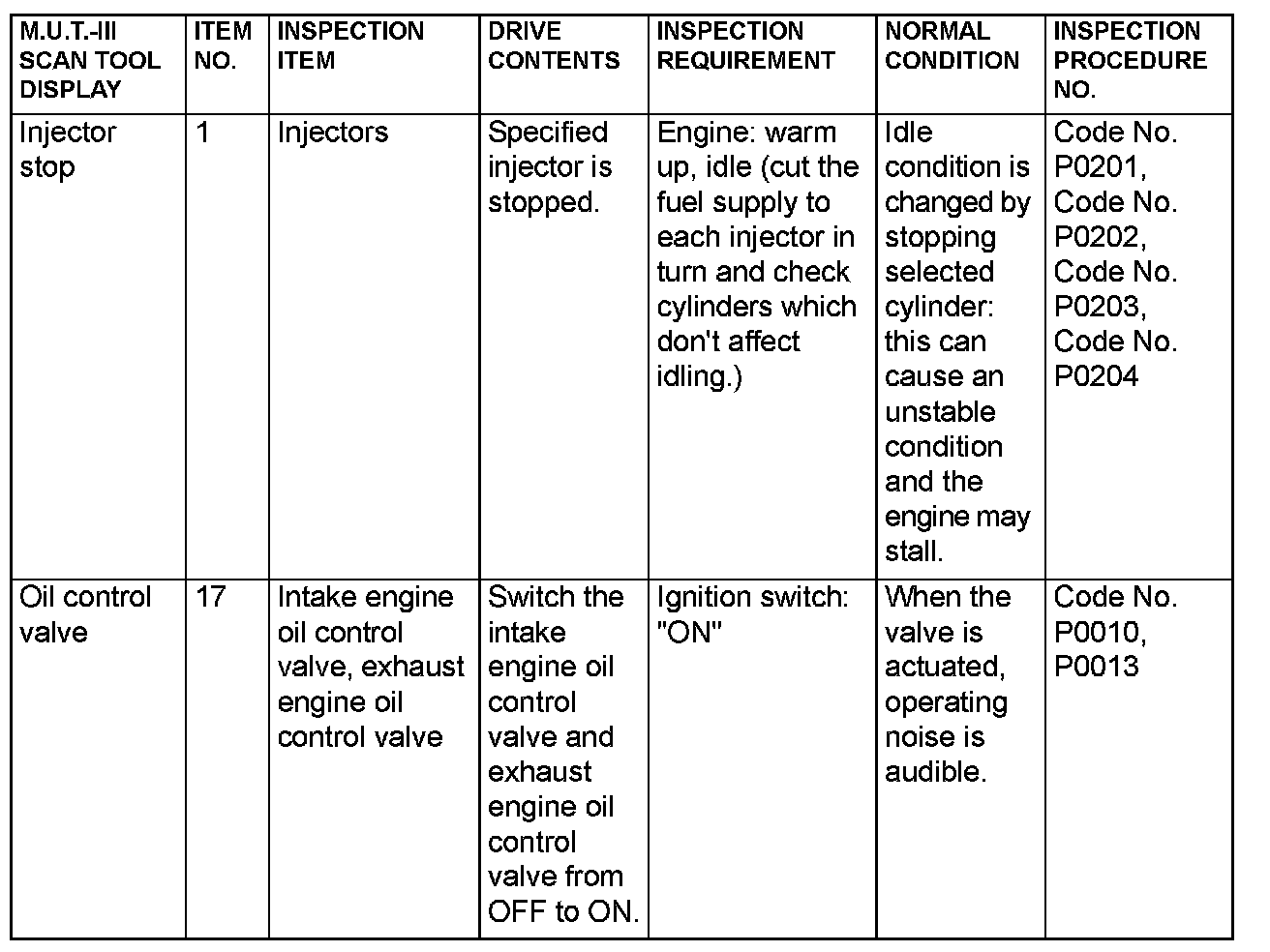 Actuator Test Reference Table (Part 2):